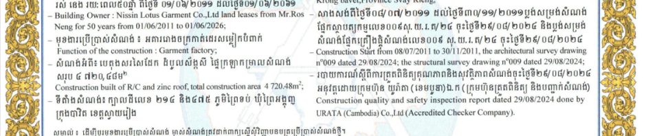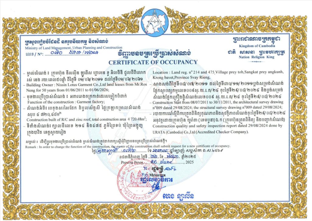 បន្ទាប់ពីNLG បានដាក់ពាក្យស្នើសុំការប្រើប្រាស់សំណង់ទៅក្រសួងរៀបចំដែនដី នគរូបនីយកម្ម និងសំណង់ នៅថ្ងៃទី២៦ ខែ មិថុនា ឆ្នាំ២០២៥ យើង(NLG)បានទទួលវិញ្ញបនបត្រប្រើប្រាស់សំណង់ហើយ។