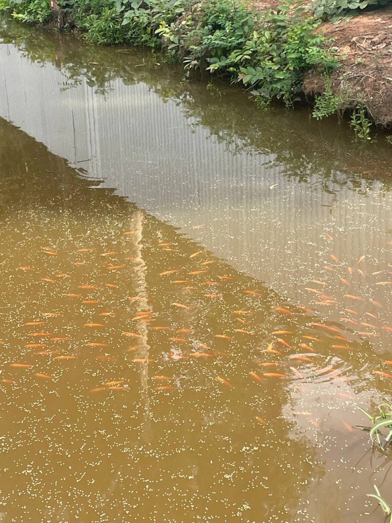 We released young fish into a fish farming pond dug next to the factory. When grow up these fish will be eat for the employee live in the dormitory .